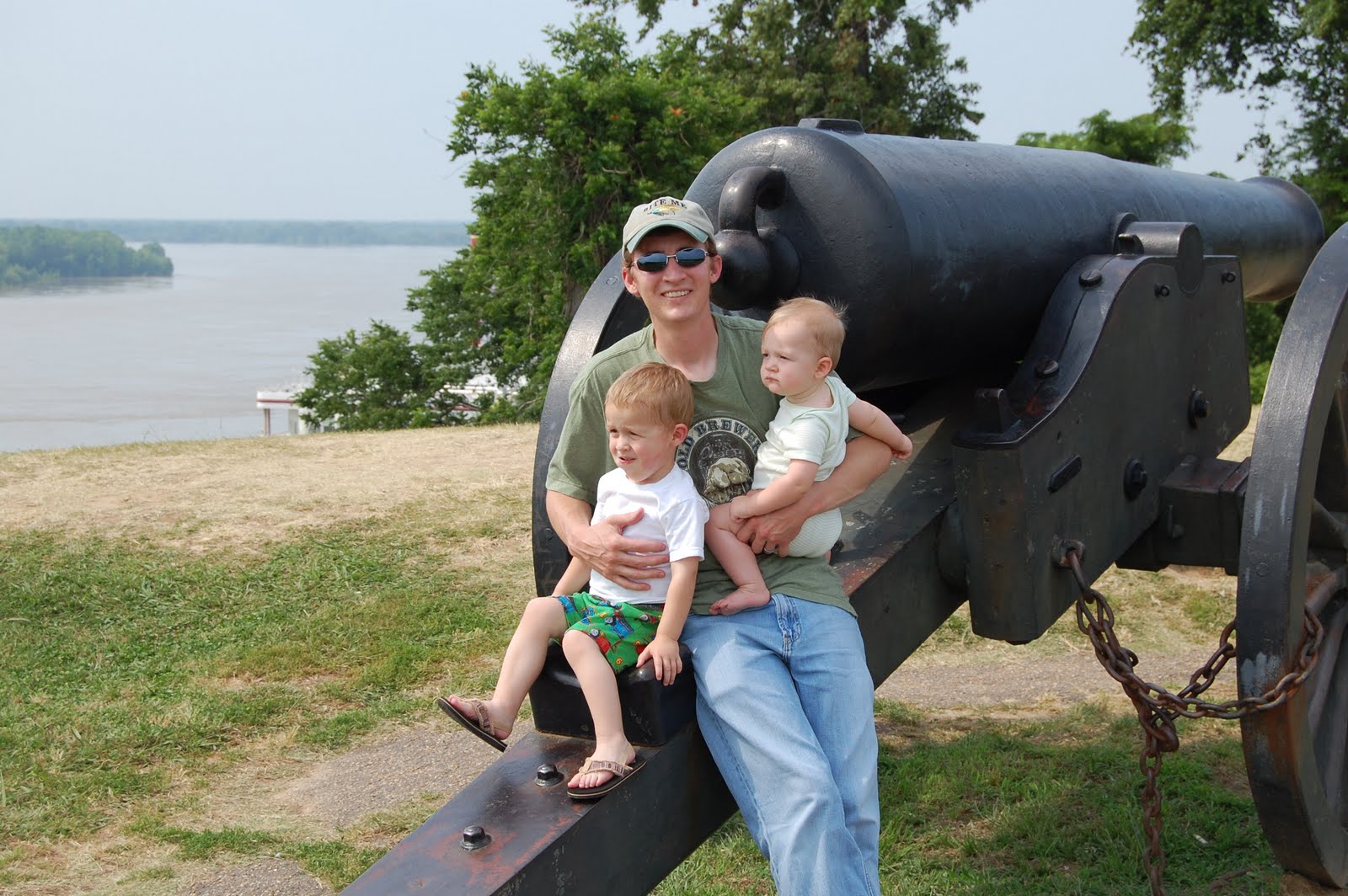 | Mom and boys at the Vicksburg, MS welcome center. Water was very high. |